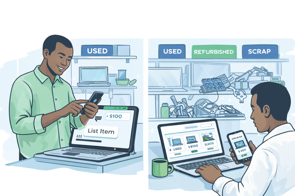 Sell surplus equipment, refurbished electronics, and recovered materials through a transparent, verified marketplace.